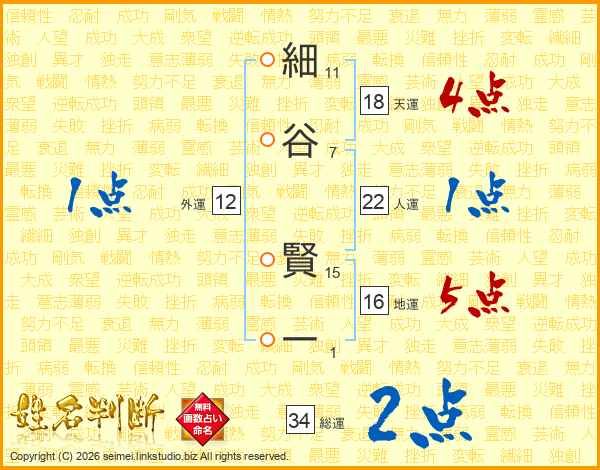 あなたの人生を表す1番重要な運勢です。生涯を通じて影響する総合運となり、主に50歳以降の晩年期に影響を及ぼします。苗字と名前の合計画数。