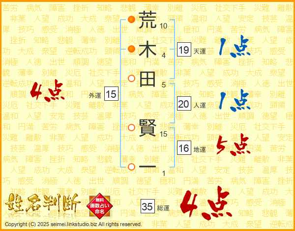 荒(10画)木(4画)田(5画) 賢(15画)一(1画)