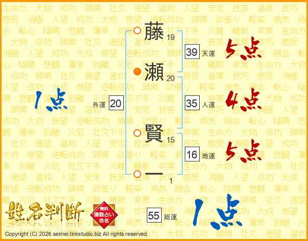 藤(19画)瀬(20画) 賢(15画)一(1画)