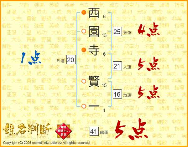 西(6画)園(13画)寺(6画) 賢(15画)一(1画)