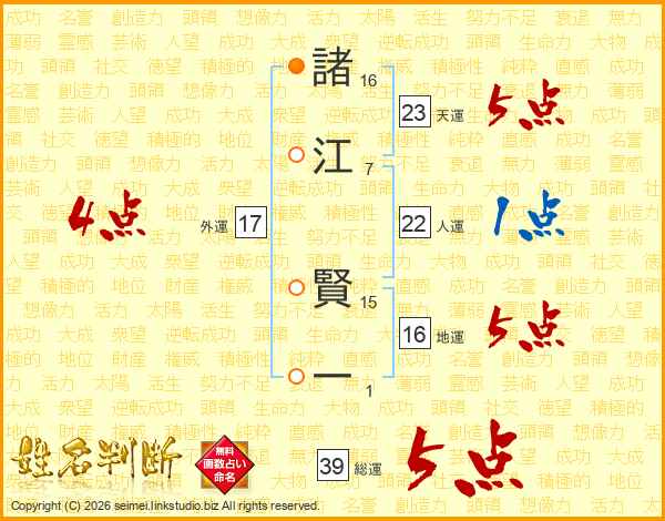 あなたの人生を表す1番重要な運勢です。生涯を通じて影響する総合運となり、主に50歳以降の晩年期に影響を及ぼします。苗字と名前の合計画数。