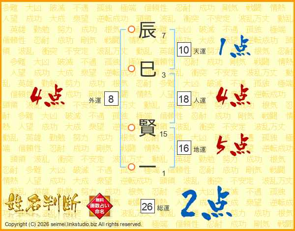 辰巳賢一さんの総運は26画の2点!