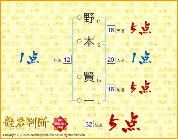 野本賢一さんの総運は32画の5点!