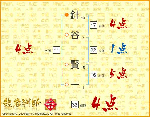 生活面を象徴する運勢です。外部から受ける影響力を表し、結婚運、家庭運や職場、環境への順応性を表します。総運から人運を引いた画数。姓や名が1文字の場合を除く。