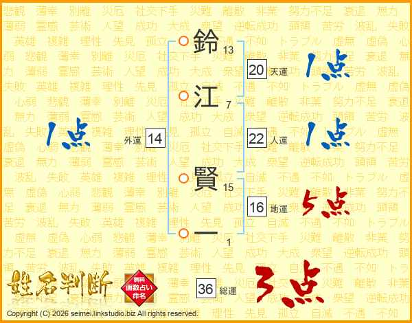 鈴(13画)江(7画) 賢(15画)一(1画)