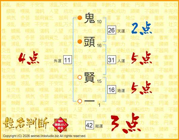 鬼(10画)頭(16画) 賢(15画)一(1画)