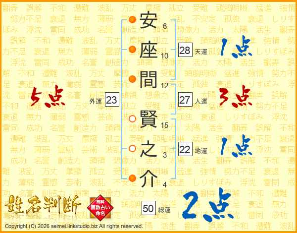 安(6画)座(10画)間(12画) 賢(15画)之(3画)介(4画)