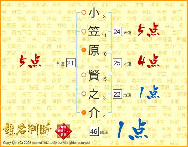 小(3画)笠(11画)原(10画) 賢(15画)之(3画)介(4画)