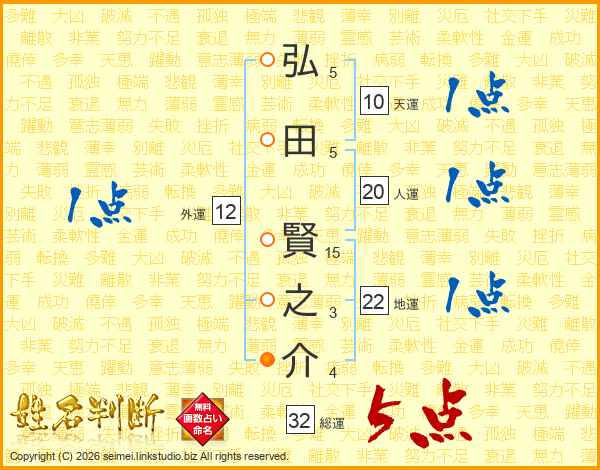 弘(5画)田(5画) 賢(15画)之(3画)介(4画)