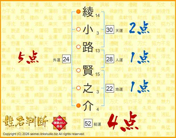 綾(14画)小(3画)路(13画) 賢(15画)之(3画)介(4画)