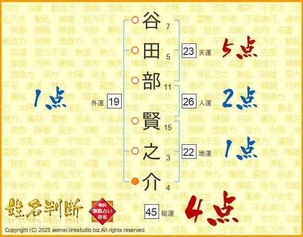 谷(7画)田(5画)部(11画) 賢(15画)之(3画)介(4画)