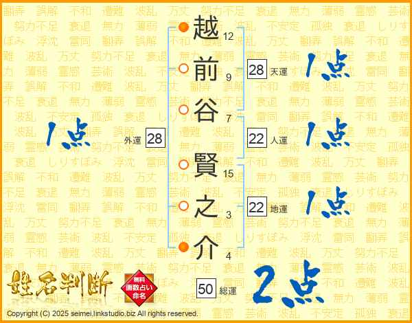 越(12画)前(9画)谷(7画) 賢(15画)之(3画)介(4画)