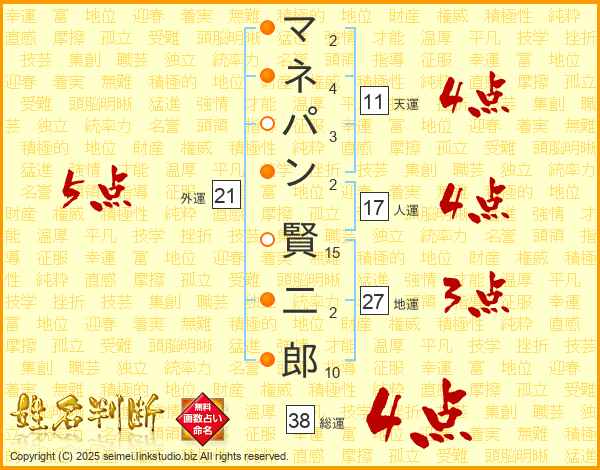 マネパン賢二郎さんの総運は38画の4点!