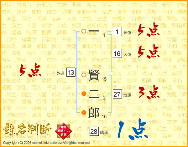 あなたの人生を表す1番重要な運勢です。生涯を通じて影響する総合運となり、主に50歳以降の晩年期に影響を及ぼします。苗字と名前の合計画数。