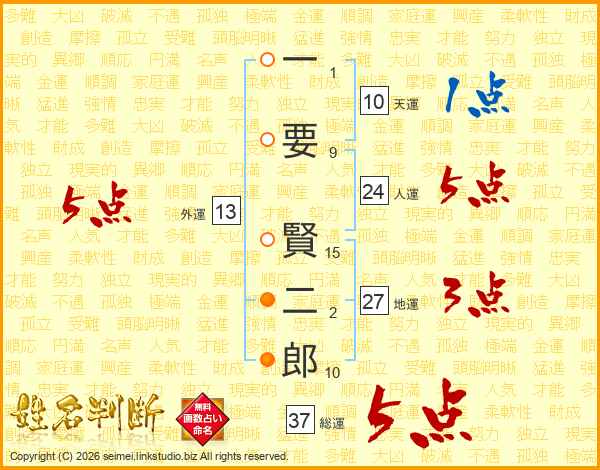 一(1画)要(9画) 賢(15画)二(2画)郎(10画)