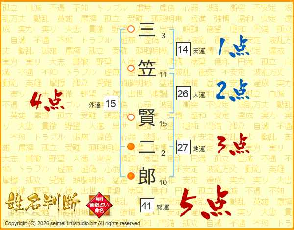 三(3画)笠(11画) 賢(15画)二(2画)郎(10画)