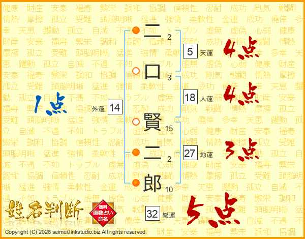 二(2画)口(3画) 賢(15画)二(2画)郎(10画)