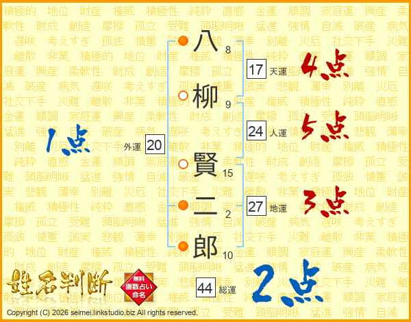八(8画)柳(9画) 賢(15画)二(2画)郎(10画)