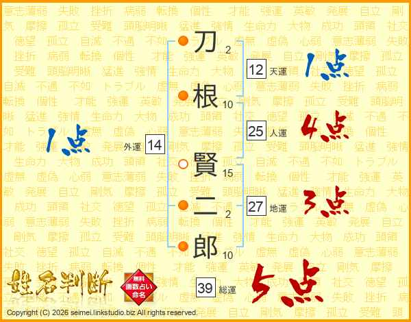 刀根賢二郎さんの総運は39画の5点!