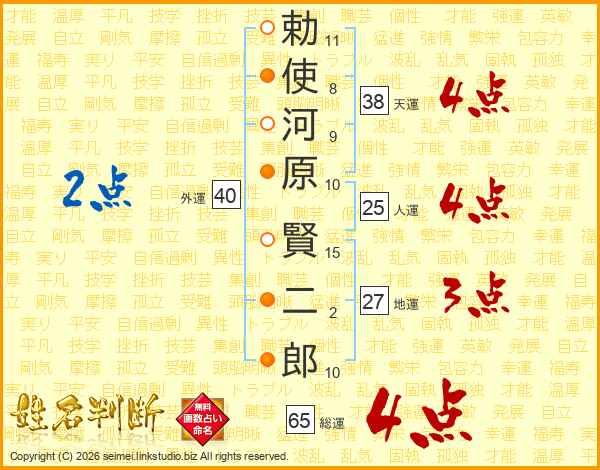 勅使河原賢二郎さんの総運は65画の4点!
