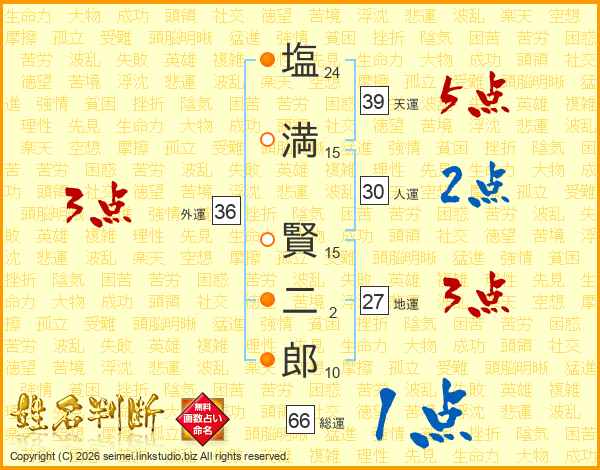 塩(24画)満(15画) 賢(15画)二(2画)郎(10画)