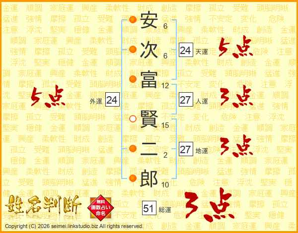 安(6画)次(6画)富(12画) 賢(15画)二(2画)郎(10画)