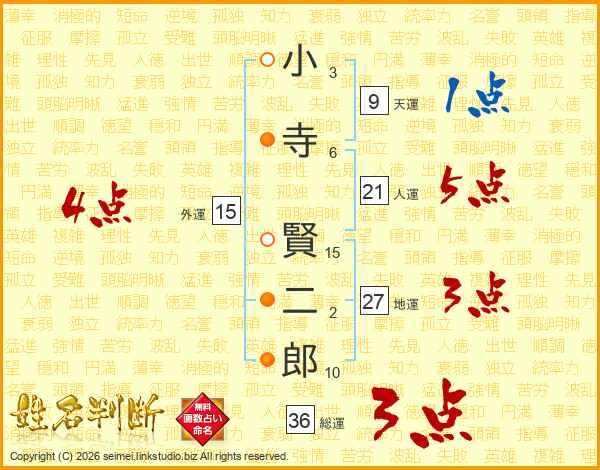 小(3画)寺(6画) 賢(15画)二(2画)郎(10画)