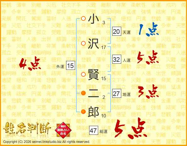小(3画)沢(17画) 賢(15画)二(2画)郎(10画)