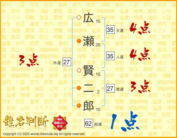 広(15画)瀬(20画) 賢(15画)二(2画)郎(10画)