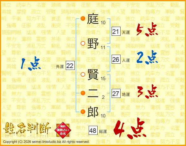 庭(10画)野(11画) 賢(15画)二(2画)郎(10画)