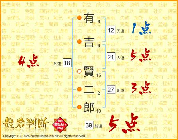 有(6画)吉(6画) 賢(15画)二(2画)郎(10画)