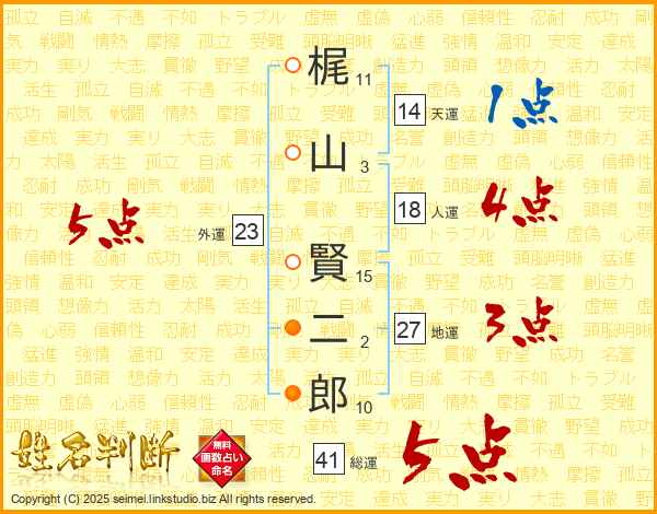 梶(11画)山(3画) 賢(15画)二(2画)郎(10画)