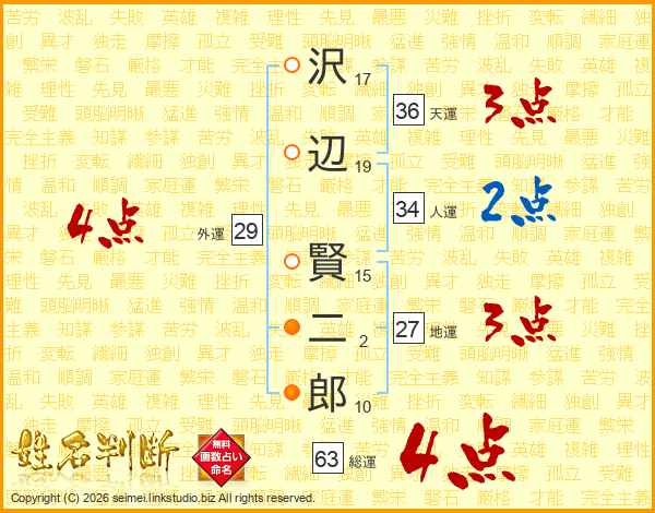 沢(17画)辺(19画) 賢(15画)二(2画)郎(10画)
