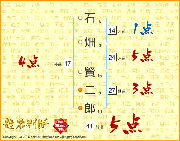 石(5画)畑(9画) 賢(15画)二(2画)郎(10画)