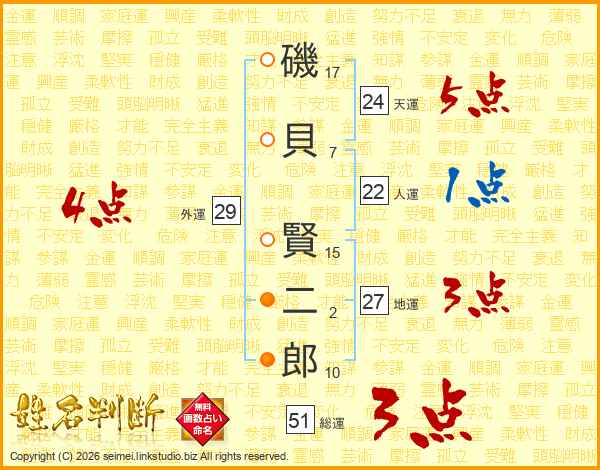 磯(17画)貝(7画) 賢(15画)二(2画)郎(10画)