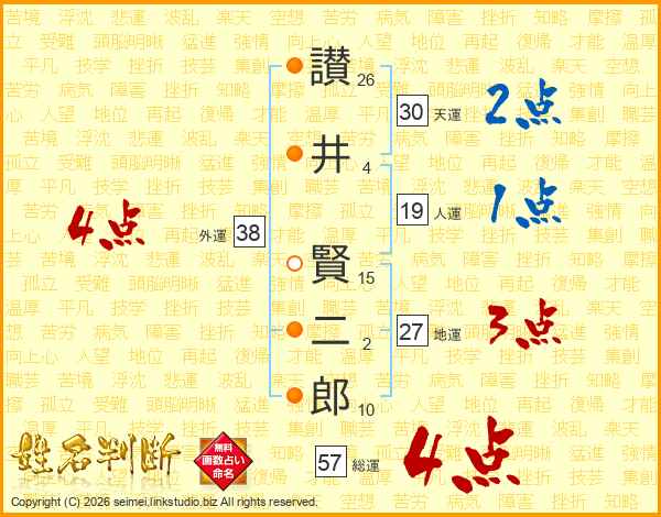 讃(26画)井(4画) 賢(15画)二(2画)郎(10画)