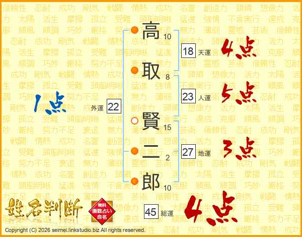 高取賢二郎さんの総運は45画の4点!