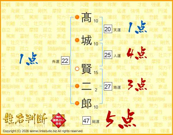髙城賢二郎さんの総運は47画の5点!