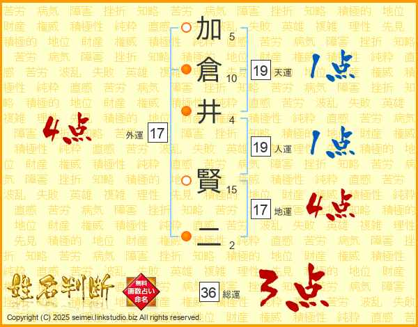 加(5画)倉(10画)井(4画) 賢(15画)二(2画)