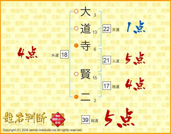 大(3画)道(13画)寺(6画) 賢(15画)二(2画)