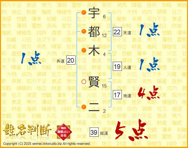 宇(6画)都(12画)木(4画) 賢(15画)二(2画)