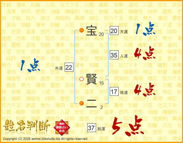 生活面を象徴する運勢です。外部から受ける影響力を表し、結婚運、家庭運や職場、環境への順応性を表します。総運から人運を引いた画数。姓や名が1文字の場合を除く。