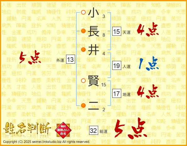 小(3画)長(8画)井(4画) 賢(15画)二(2画)