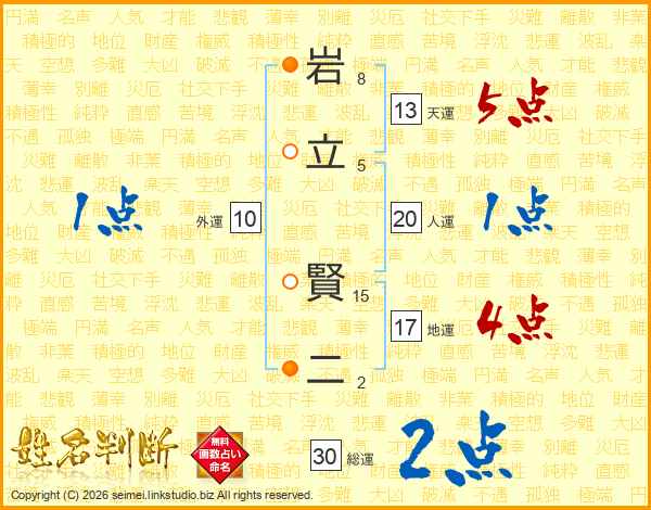 生活面を象徴する運勢です。外部から受ける影響力を表し、結婚運、家庭運や職場、環境への順応性を表します。総運から人運を引いた画数。姓や名が1文字の場合を除く。