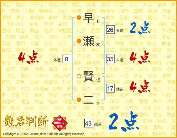 早(6画)瀬(20画) 賢(15画)二(2画)