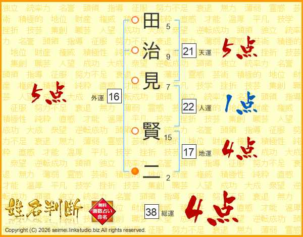 田(5画)治(9画)見(7画) 賢(15画)二(2画)