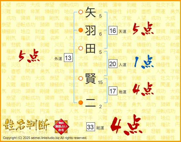 矢(5画)羽(6画)田(5画) 賢(15画)二(2画)