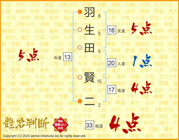 羽(6画)生(5画)田(5画) 賢(15画)二(2画)