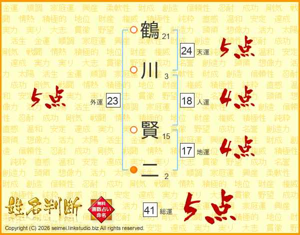 鶴(21画)川(3画) 賢(15画)二(2画)