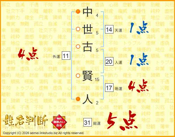 中(4画)世(5画)古(5画) 賢(15画)人(2画)